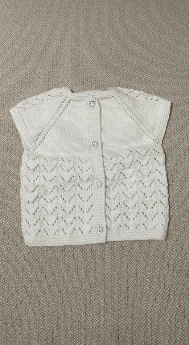 Kız,erkek çocuklar için beyaz renkli, vintage tarzda, düğmeli ve ince örgü desenlere sahip kolsuz, vücuda oturan örgü hırka.