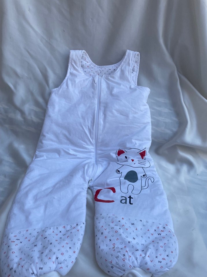Bebekler için beyaz pamuklu, fermuarlı ve kolsuz uyku tulumu. Ayaklarda renkli kedi ve harf desenleri bulunur. Pamuklu kumaşı sayesinde nefes alır ve sıcak tutar Orijinal marka