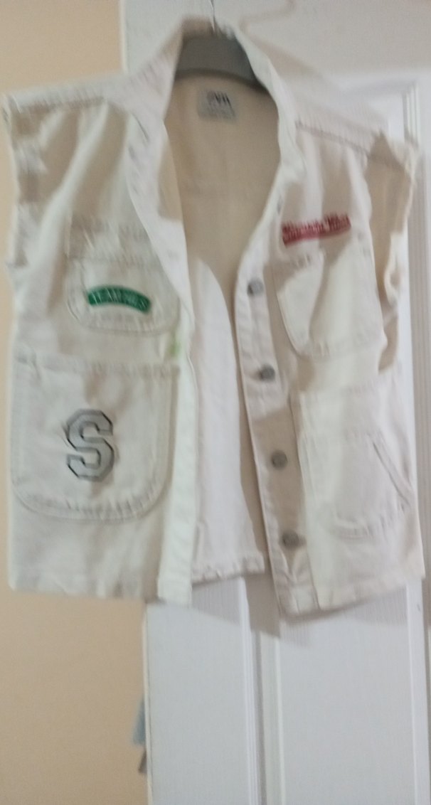 yenidir Düğmeli, pamuklu, beyaz renk kız erkek unisex çocuk yeleği. Kolsuz, regular fit ve baskılı detaylara sahip, sokak tarzı için uygun.