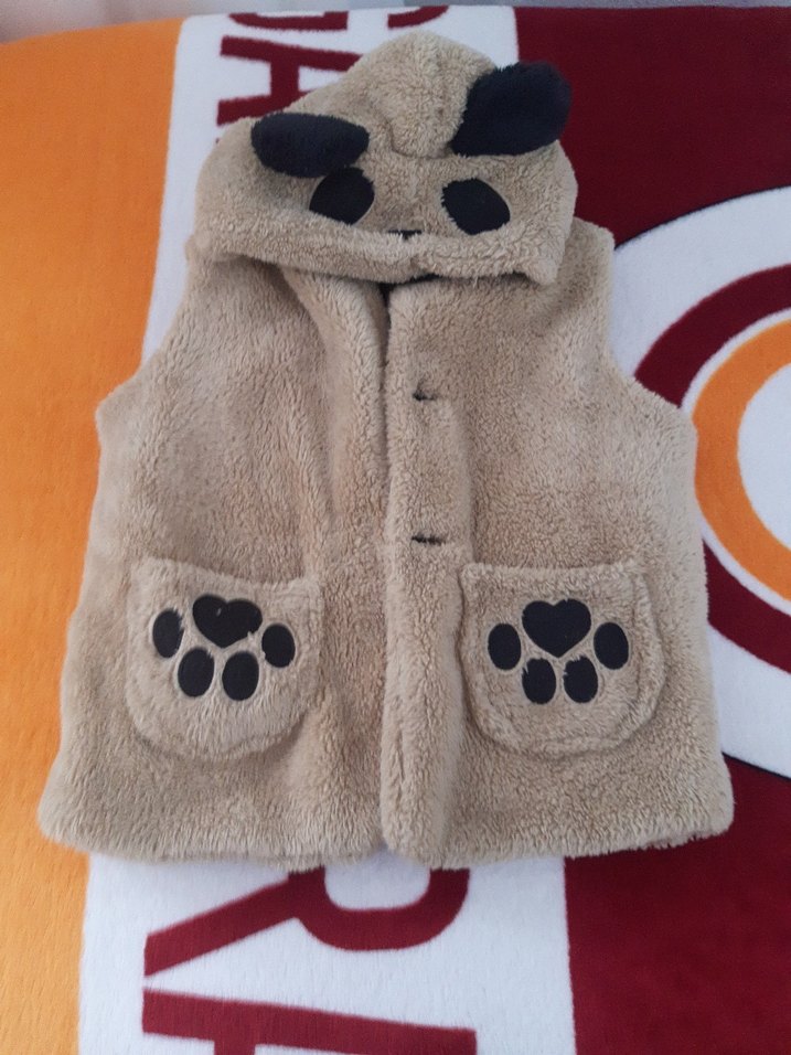 Kahverengi, kapüşonlu ve kürklü detaylı kız erkek çocuk yeleği. Cep üzerinde işlenmiş pati desenleri ve yumuşak, sıcak kumaşla sokak stili için uygun. boyner urunudur