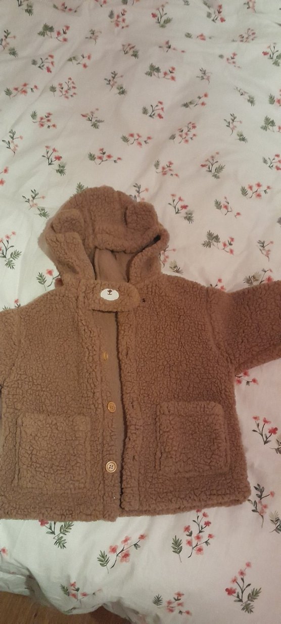 Kahverengi, peluş dokulu, kapüşonlu kiz/erkek çocuk ceketi. Düğmeli, bol kesim ve iki ön cepli, rahat kullanıma uygun. sayılı giyilmistir