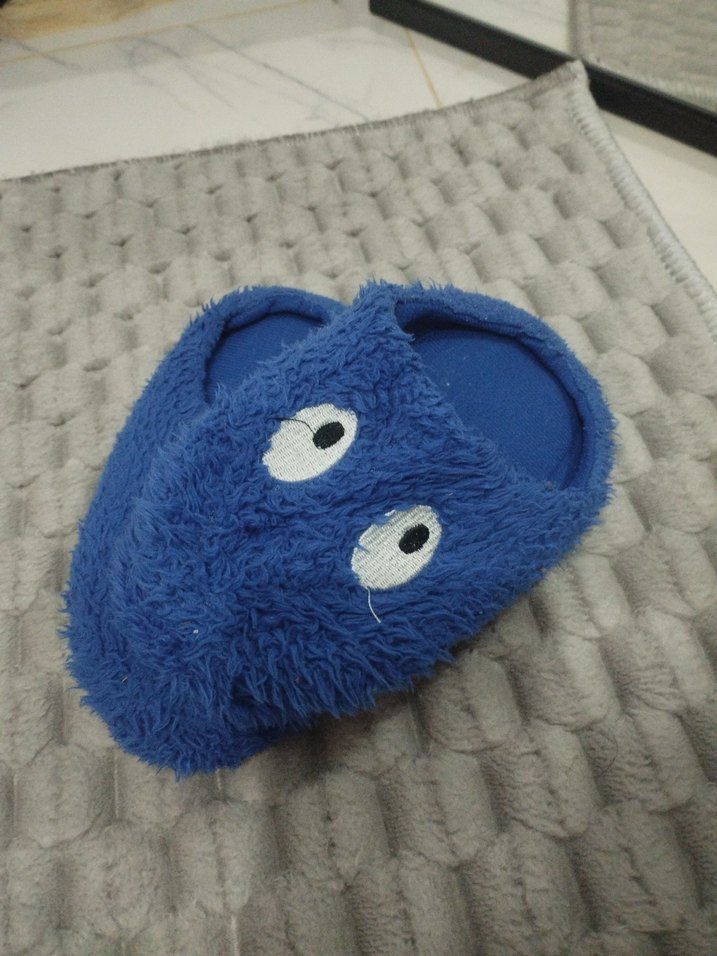 Nakışlı göz detaylı, mavi renkli yumuşak tüylü kız çocuk ev terliği. Rahat ve sıcak, günlük sokak stili uyumlu.