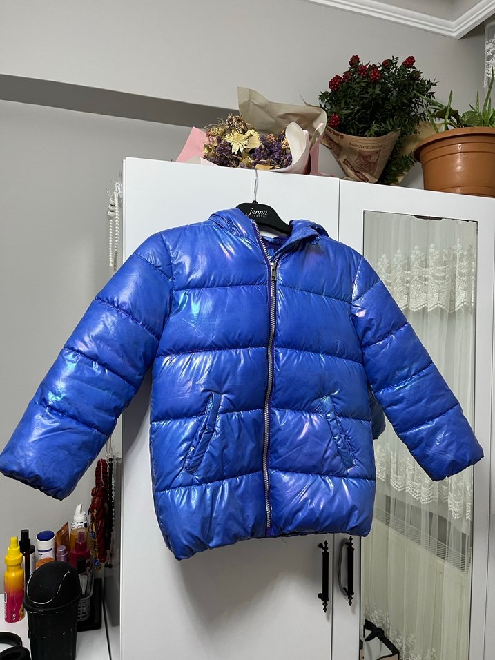 Parlak mavi renkte, kapüşonlu kısa kesim mont. Uzun kollu, yumuşak ve sıcak kumaştan, dış mekan için uygun. 2 kez kullanıldı 7-8 yaştır.