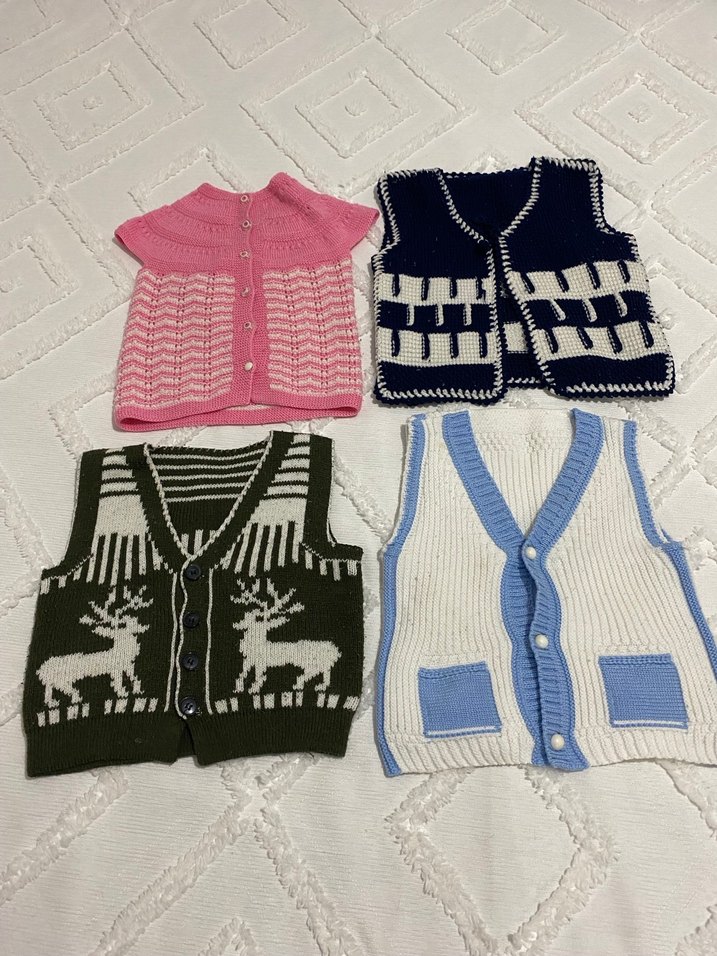 Kız çocuklar için kolsuz, örgü, nakışlı desenlere sahip pastel ve çok renkli yelekler. Sokak tarzı için uygun, vücuda oturan kesim. Ufak tefek kusurları var fotoğraflarda belirttim Fiyatı 4 ü için geçerli