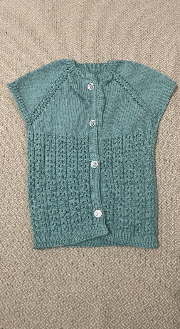 Turkuaz renkli, örgü dokulu, kolsuz kız,erkek çocuk hırkasıdır. Düğmeli ve bol kesimdir, rahatlık sağlar. 1-2 yaş