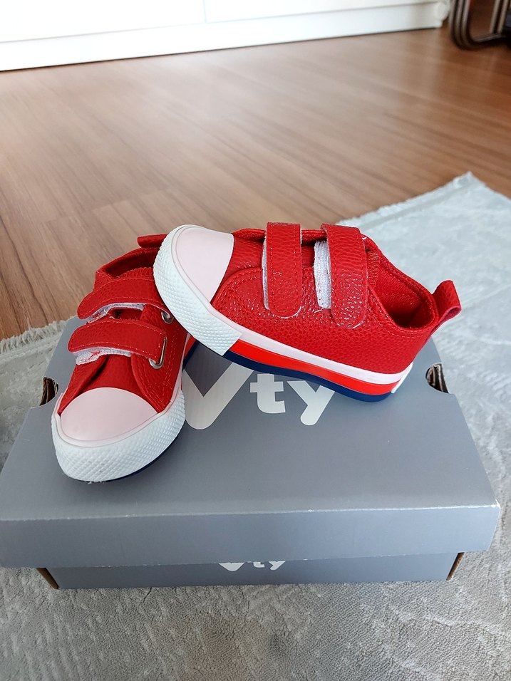 Kız çocukları için renkli kırmızı, baskılı detaylı, lastik tabanlı spor ayakkabılar. Cırt cırtlı kapanışıyla rahat kullanım sağlar.