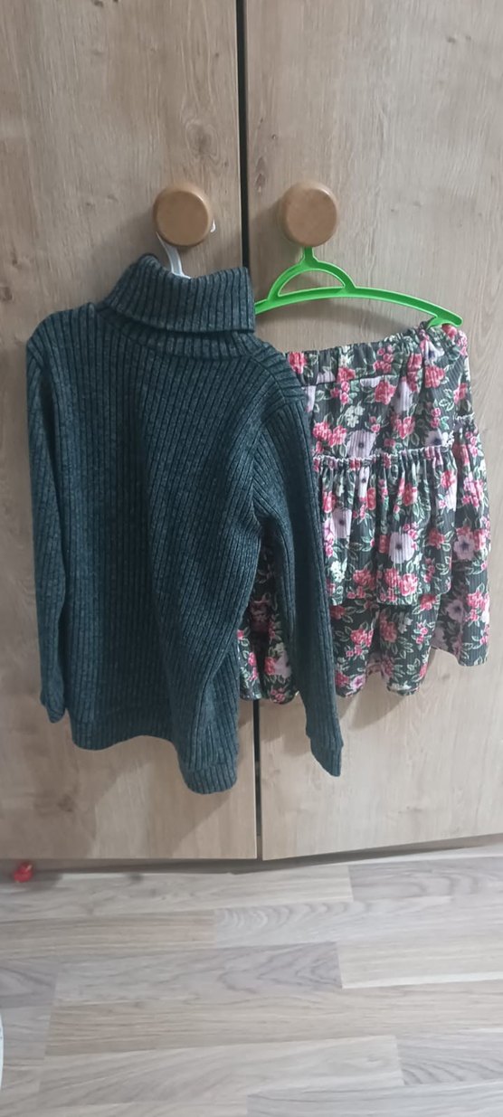 Gri renkli, örgü kumaştan yapılmış kız kazak, bol kesim ve uzun kolludur. Desensiz ve normcore tarzındadır. eteği ile birlikte çok şık kışlık bir takım 10-12 yaş arası uyumludur