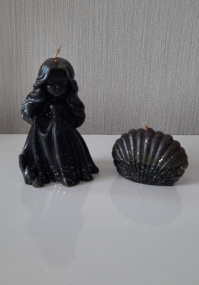 Siyah renkli, simli dekoratif ikili mum. Kız figürünün boyu 9 cm. İstiridyenin boyu 4 cm