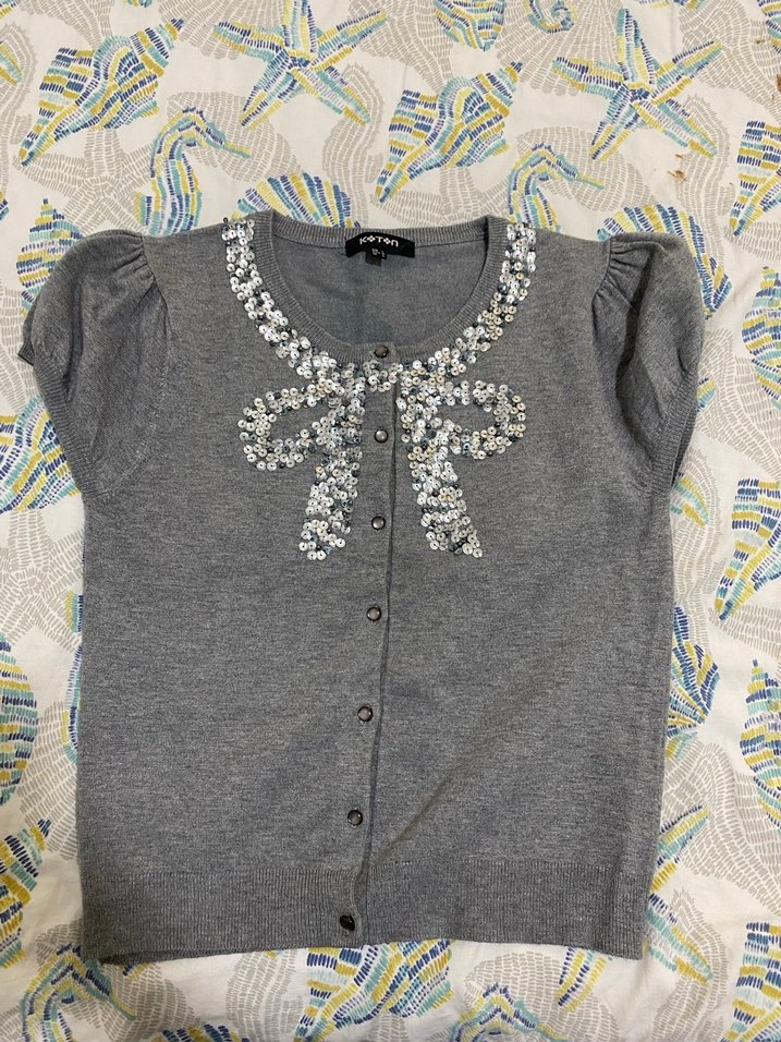 Kızlar için gri kısa kollu, düğmeli, nakışlı desenli örgü hırka. Rahat ve bol kesim, sokak stiline uygun.