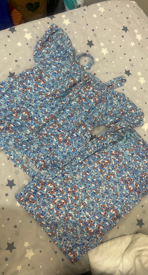 Renkli mavi bağlama desenli, kısa kollu, ikili takım yemi gibidir