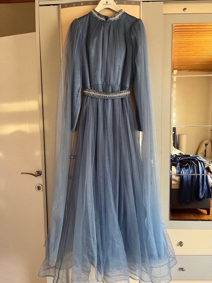 Bu uzun mavi abiye elbise, yüksek yakalı, uzun kollu ve bol kesimdir. Drapeli tasarımı ve bel ile yakadaki zarif süslemeleriyle vintage esintili klasik şıklık sunar. Nişanlık düğün için kına için bütün her taraflarda giyilir bir sorun yoktur 42 bedendir ama 40 bedene daha uygundur isteyenler olursa fotoğraf özel olarak atılır