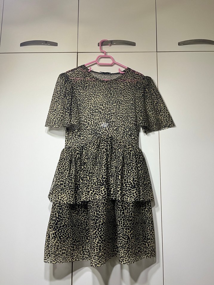 baskılı, kısa kollu, yuvarlak yakalı ve fırfırlı detaylı . Sentetik kumaştan, sokak modasına uygun kesim.