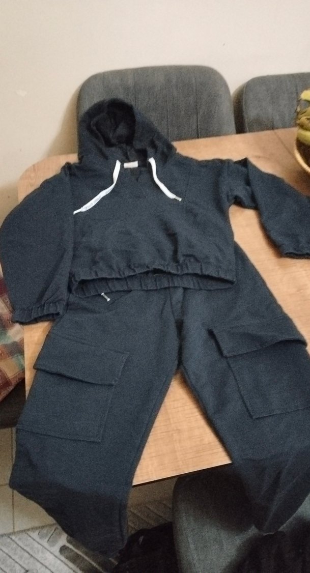 Koyu gri renkte, kapüşonlu sweatshirt ve kemerli bol kesim eşofman altından oluşan, yumuşak ve sıcak kumaştan yapılmış kız çocuk eşofman takımı. ️