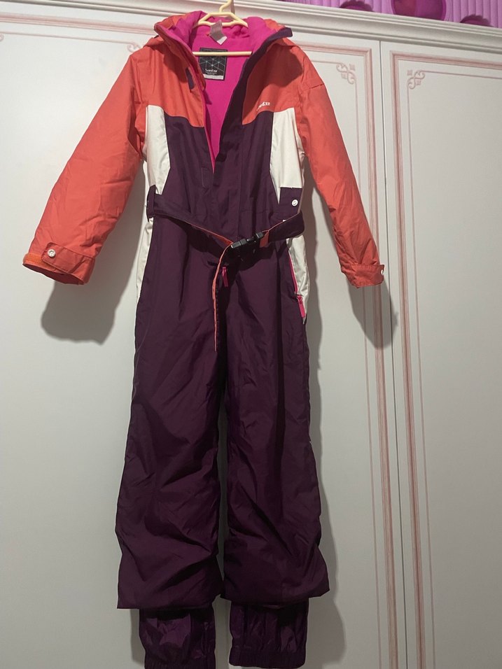 Kemerli bel ve kesik yaka detaylı, koyu mor ve mercan renkli kız kayak tulumu. Sıcak tutar ve şık görünür. ❄️