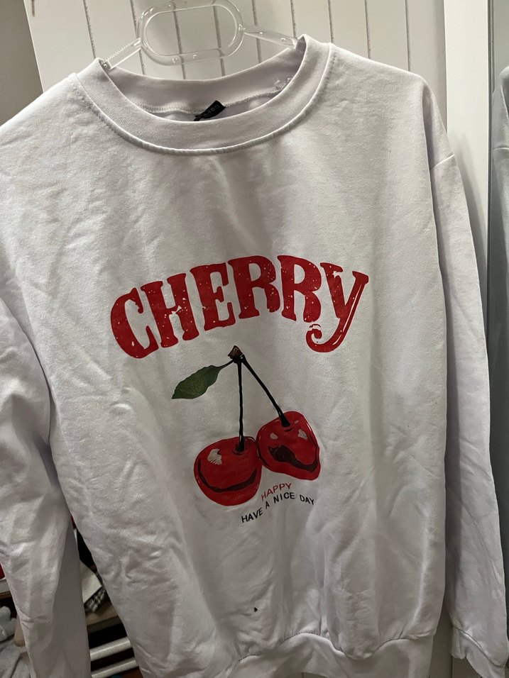 Beyaz pamuklu, uzun kollu, yuvarlak yaka kız çocuk sweatshirtü. Parlak kiraz baskısı hiç giyilmedi Trendyol’den aldım