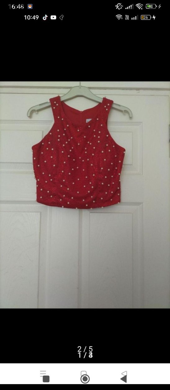 V yaka, kolsuz, boncuk ve nakış detaylı, parlak kırmızı kumaştan yapılmış, dar kesim kız crop abiye göbekten acik bluzu.✨