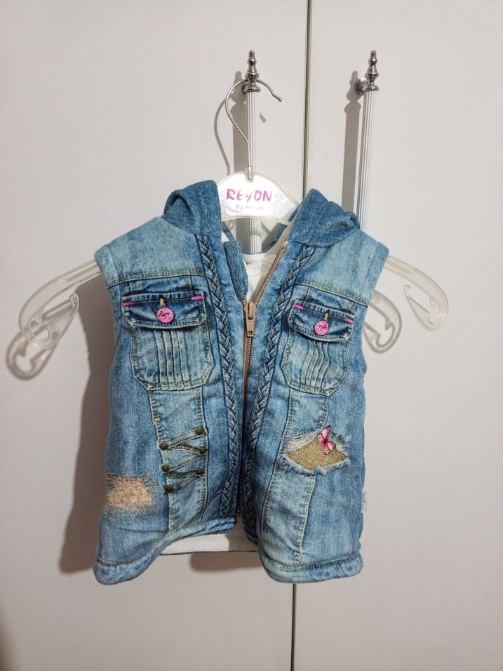 Pastel mavi renkte fitted kız kot yelek. Notched lapel kesimi ve sokak modası tarzında tasarlanmıştır.