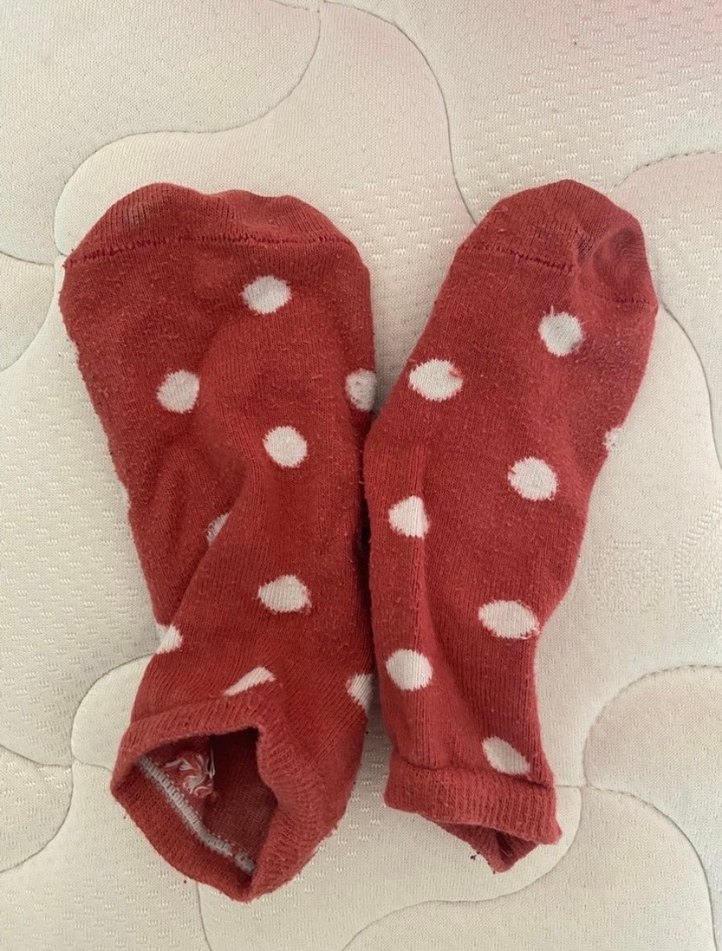 Kız için kırmızı üzerinde beyaz puantiyeli, yumuşak ve sıcak kumaştan yapılmış renkli çoraplar. Kullanılmış çorap. Giyilmiş çorap.