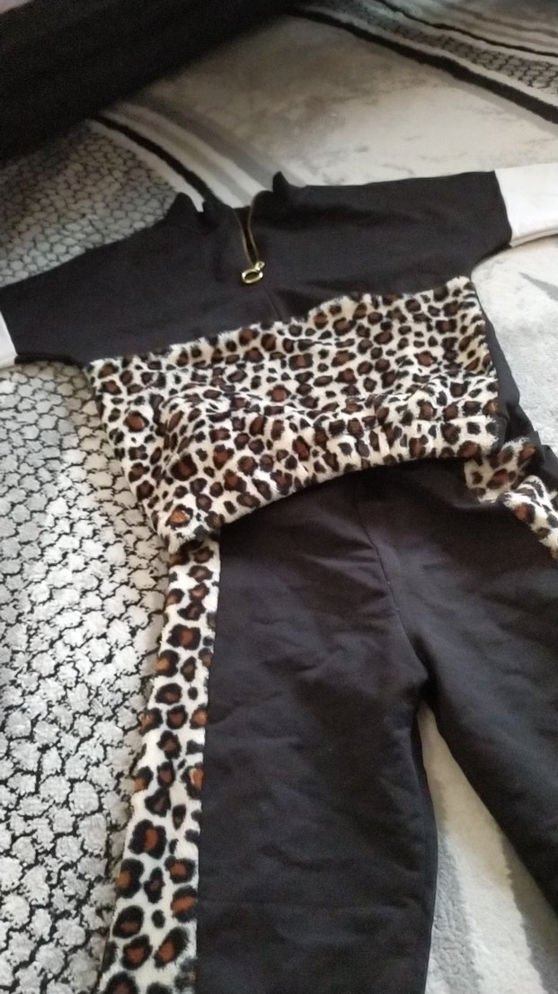Dar kesim kız takımı, koyu kahverengi sentetik kumaş ve leopar desenli detaylara sahip. Kısa kollu, yüksek yakalı ve fermuarlı tasarım.