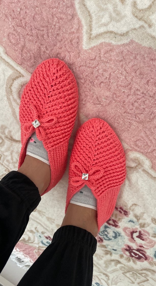 Kızlar için pembe örgü, sade ve renkli tasarıma sahip sıcak ev terliği. Küçük fiyonk ve taş detaylı, yumuşak örgü kumaştan.36 37 numara keçeden örgülü el işi modeli kullanımı çok rahat çok sıcak tutuyo isteğe göre renkler yapılır