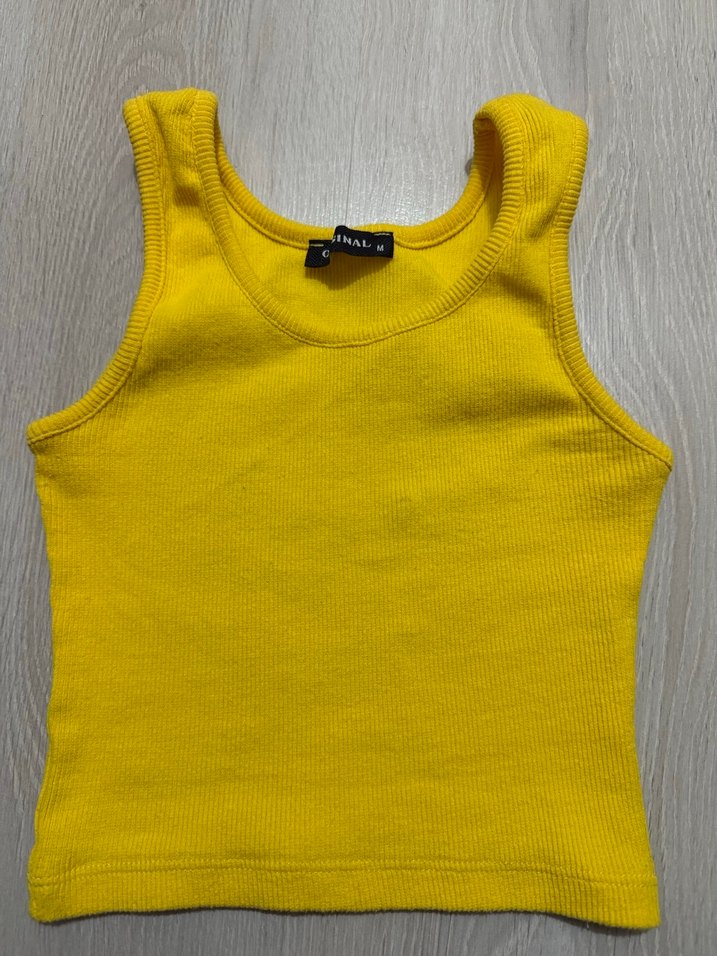 Kızlar için kolsuz, fitted kesim sarı crop, parlak sentetik kumaştan, basic ve streetwear tarzında.