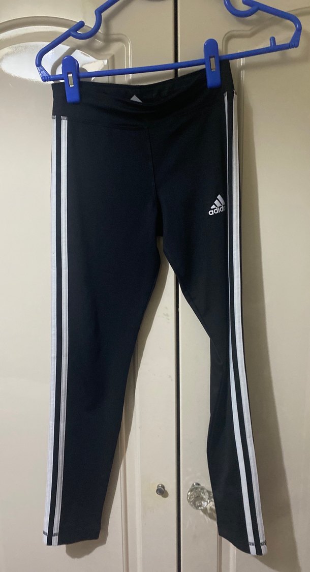 Elastik bel ve beyaz yan şeritlere sahip, siyah Adidas kız taytı, sentetik kumaştan, trend sokak stili için uygun. Sizin üstünde hafif tüylenme var okada