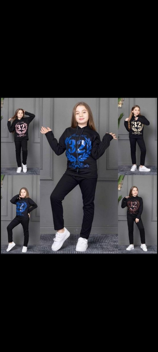 Kızlar için bol kesim, uzun kollu, yuvarlak yakalı, örgü bağcıklı ve bağlamalı desenli siyah eşofman takımı. Rahat ve sıcak kumaşlı.