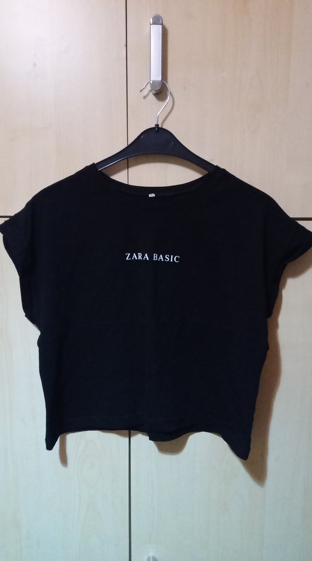 Kızlar için kısa kollu, yuvarlak yakalı siyah tişört. Bol kesim ve "ZARA BASIC" baskılı, sentetik kumaştan üretilmiştir.