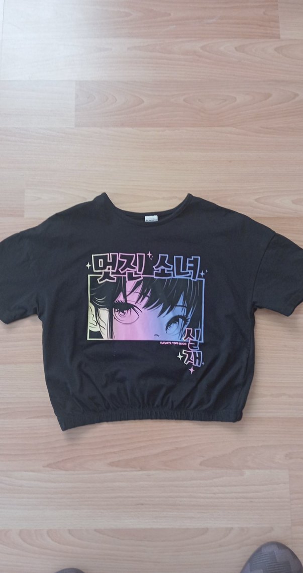 2 defa giyildi tertemiz yeni gibi.Siyah, bol kesim, yuvarlak yaka krop tarzı kız tişörtü, kısa kollu ve renkli baskılı grafikle rock punk havası taşıyor. penye kumaş.dolabimda benzerleri var.