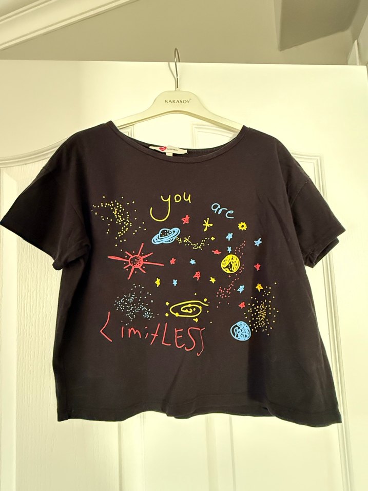 Siyah renkli, bol kesim kız tişörtü kısa kollu ve yuvarlak yakalıdır. Renkli uzay temalı baskısı ve "you are limitless" yazısı ile dikkat çeker.