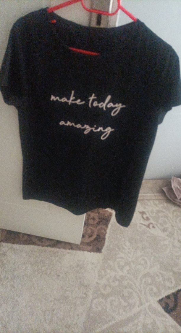 Siyah kız tişörtü, salaş kesim, kısa kollu ve bisiklet yaka. Üzerinde "make today amazing" yazılı baskı bulunur. Rahat ve şık bir sokak stili sunar.