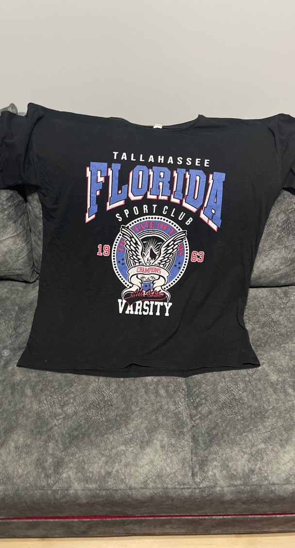 Pamuk kumaştan, bol kesim, bisiklet yaka, kısa kollu kız tişörtü. Siyah renkte, baskılı "Florida Varsity" tasarımıyla sokak stili hoşluğu sunar.