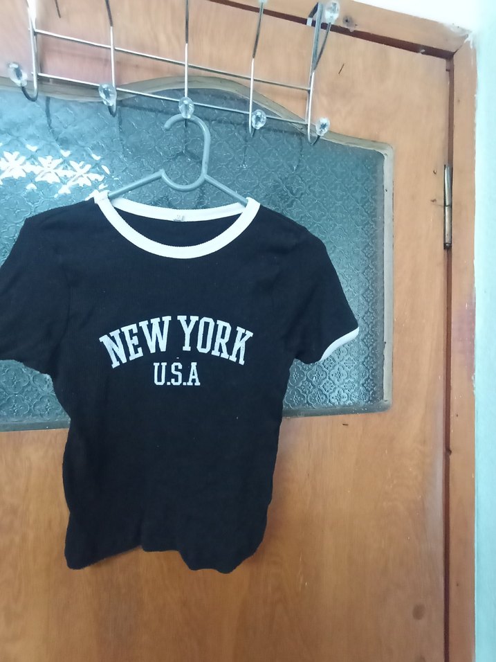 Siyah, kısa kollu, bisiklet yaka, pamuklu kız tişörtü. 'NEW YORK U.S.A' baskılı, trend sokak stili için uygun.