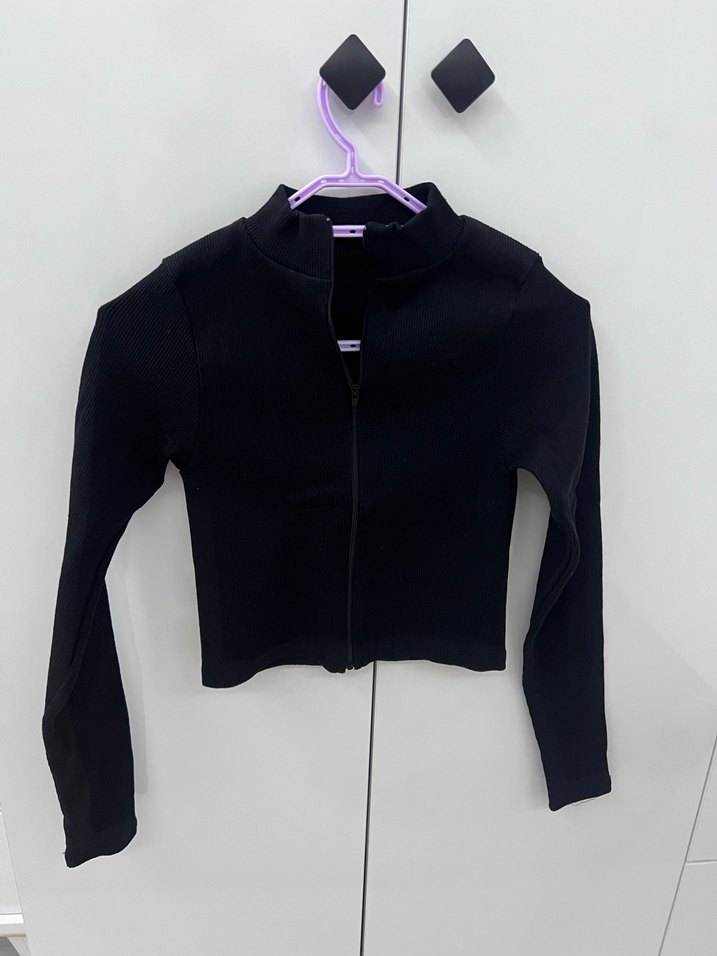 Fermuarlı, uzun kollu ve yüksek yakalı siyah bolero. Sıcak tutan yumuşak kumaştan, sokak stili için uygun.