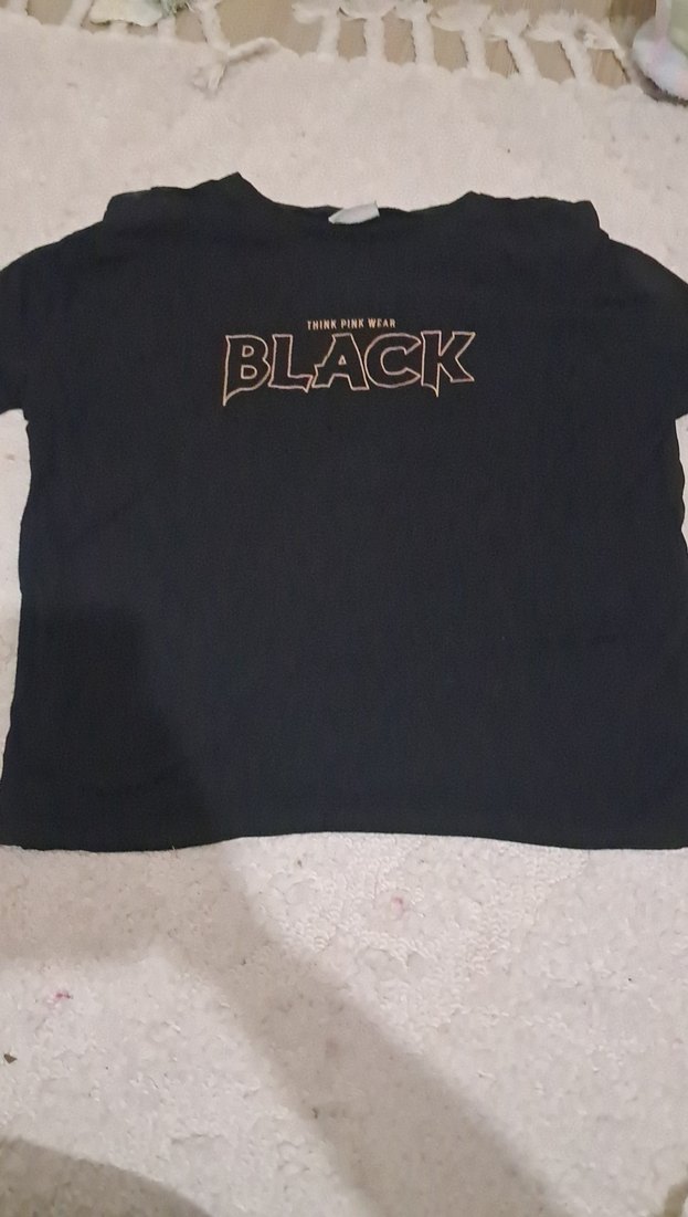 Kızlar için siyah, kısa kollu, bol kesim tişört. Bisiklet yaka, baskılı ve ipeksi dokuda, tokalı detaylı. Rock punk tarzında.