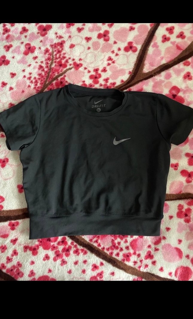 Siyah, kısa kollu, dar kesim kız tişörtü. Sentetik kumaştan ve baskılı Nike logosu ile sokak stili sunar.
