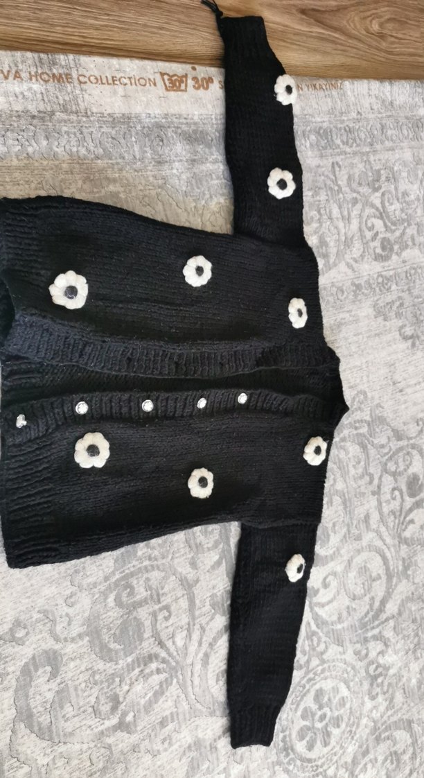Fitted kesim siyah triko hırka, uzun kollu, beyaz nakışlı çiçek desenleri ve düğmeli ön kısmı ile. Gri detaylı gotik tarz. Tüylenme oldugu için satıyorum