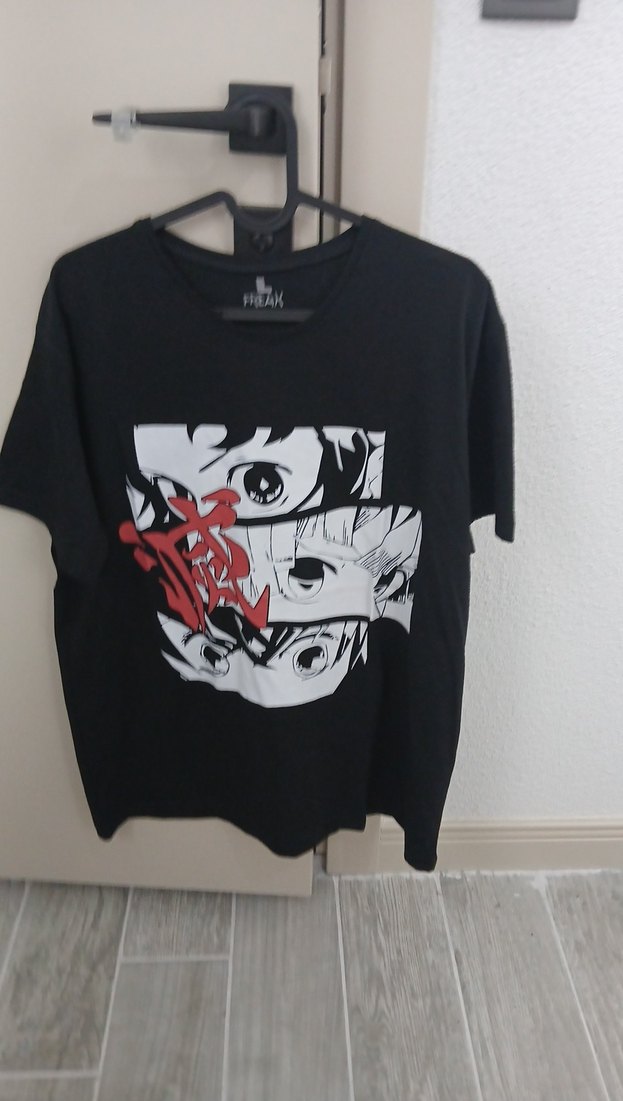 Kısa kollu, yuvarlak yaka, pamuklu siyah tişört, bol kesim ve rock punk tarzı baskılı desenle tamamlanmıştır.