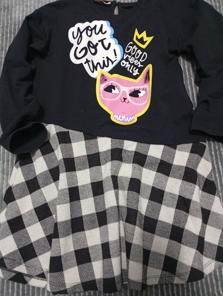 Pamuklu kumaştan yapılmış, baskılı kedili ve motivasyonel yazılı uzun kollu üst kısmı siyah, bol kesim kareli ve fırfırlı etek kısmıyla kız çocuk elbisesi.