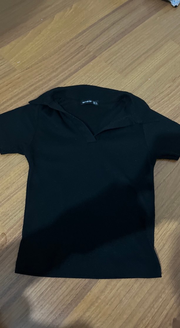 Kızlar için siyah, polo yaka ve kısa kollu, oturan kesime sahip, sentetik kumaştan yapılmış rahat ve şık tişört. S beden