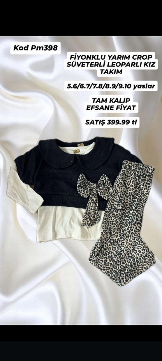 Uzun kollu, fırfırlı detaylı bebek kız takımı. Siyah üst ve beyaz iç katman ile leopar desenli pantolon ve fiyonklar içerir. 5-10 yaş aralığı.