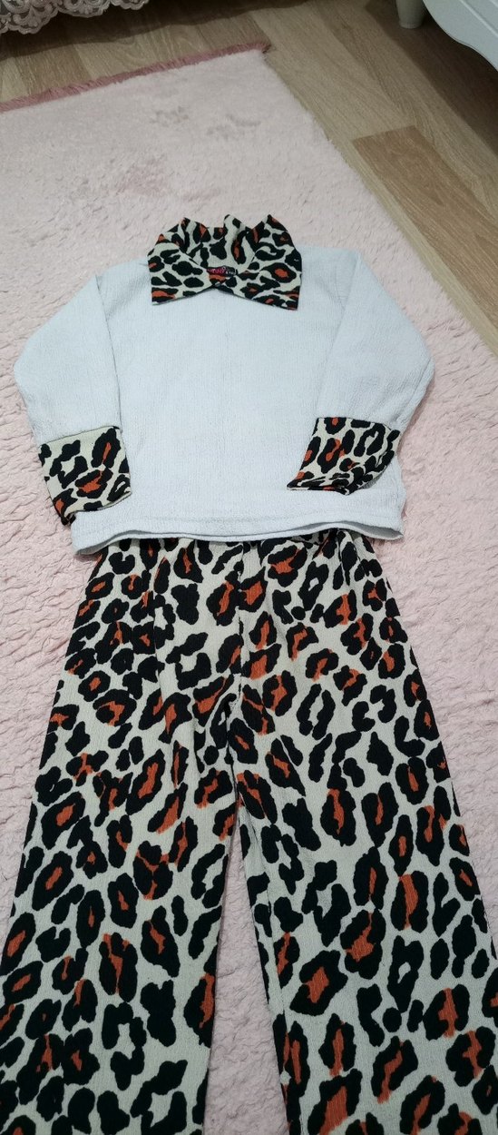 Gri uzun kollu ve kürk detaylı üst ile leopar desenli pantolon ve yaka içeren bebek kız takımı. üst gıyıldı leke yok ama ona göre alım yapın