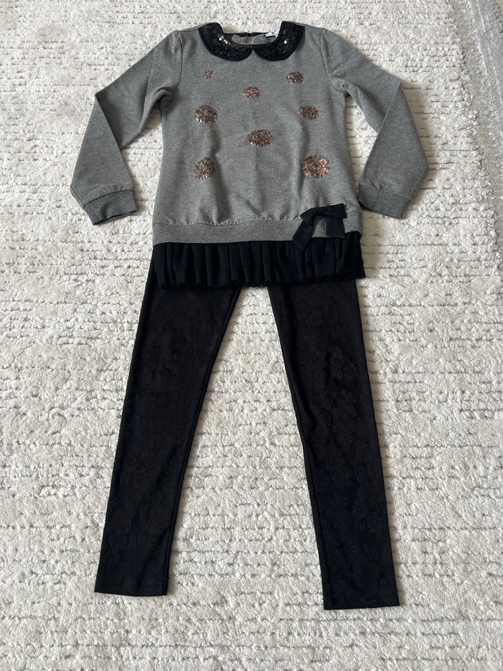 Gri nakışlı uzun kollu üst ve siyah dokulu tayttan oluşan takım.Üst kısmında yuvarlak yaka ve şık detaylar bulunur.