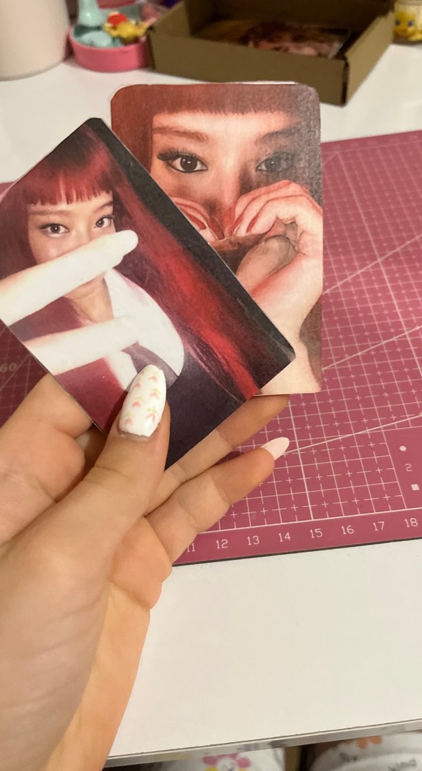 Kızın kırmızı saçlı yakın çekim fotoğraflarından oluşan kart seti. El ve yüz ifadeleri detaylı şekilde gösteriliyor.