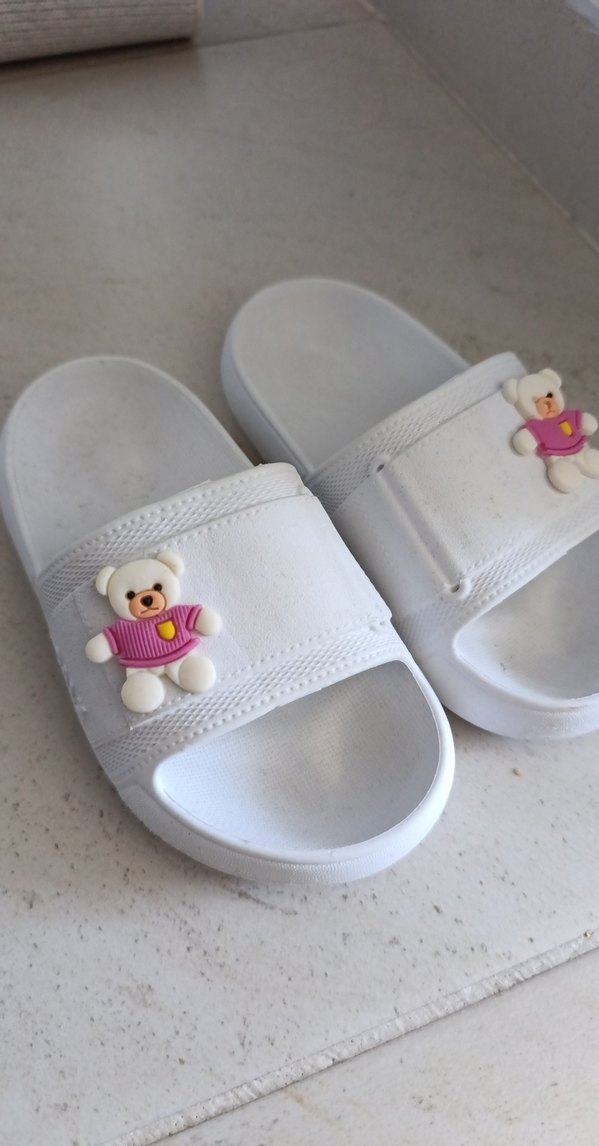 Beyaz renkte, lastik malzemeden yapılmış, tokalı ve renkli ayıcık süslemeli kız terliği ve sandalet ikisi 85 tl
