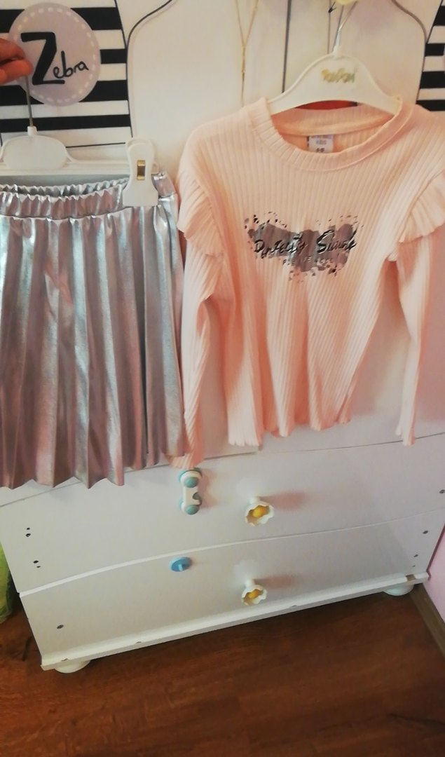 Yavruağzı üst gri baskılı ve pileli detaylara sahip etek uzun kollu, dar kesim likralı kız tişörtü 9-10 yaş Takım sıfır hiç kullanılmadı. Etek boy 37.5 tshirt boy 44 kol 44cm göğüs 30 cm.