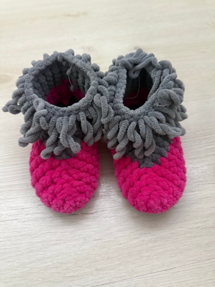 Kız ve erkek çocukları için renkli örgü ve bohem tie-dye desenli, pembe ve gri tonlarda sıcak ev terliği. 24-25 numaraya uygundur. Çok az kullanıldı.