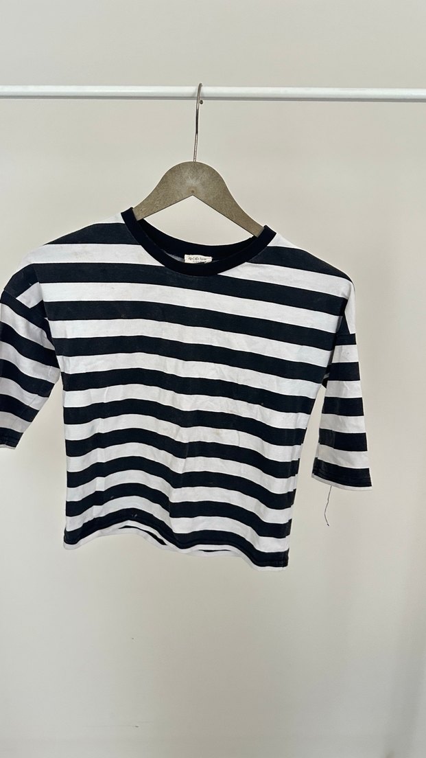 Kız çocuk için uzun kollu, yuvarlak yakalı ve bol kesim tişört. Pamuklu kumaştan üretilmiş, siyah beyaz yatay çizgilerle dikkat çeker.
