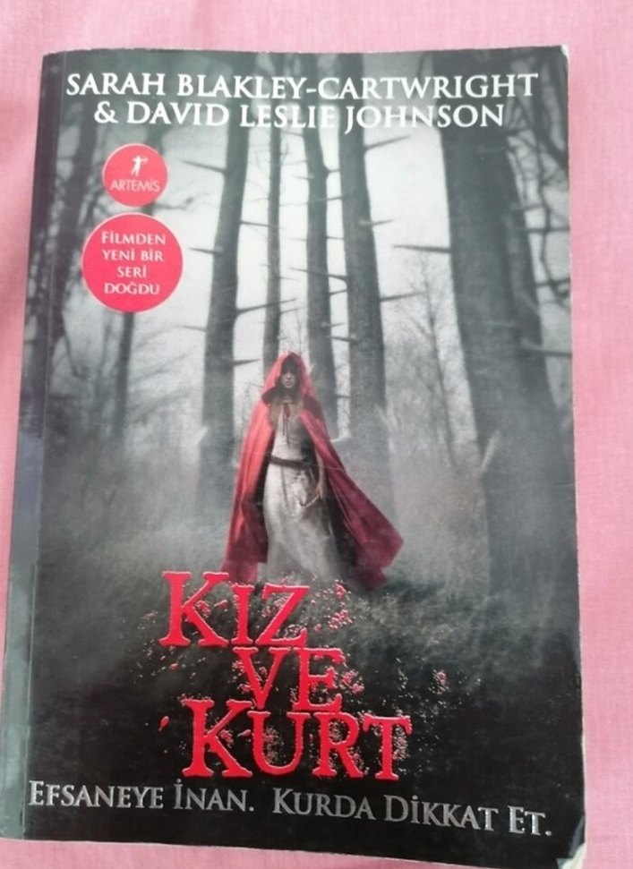 Sarah Blakley-Cartwright ve David Leslie Johnson'ın 'Kız ve Kurt' adlı romanı. Kızın kırmızı pelerinli orman sahnesi, film serisinden ilham alınmıştır. Artemis Yayınları 344 sayfa #roman#artemis