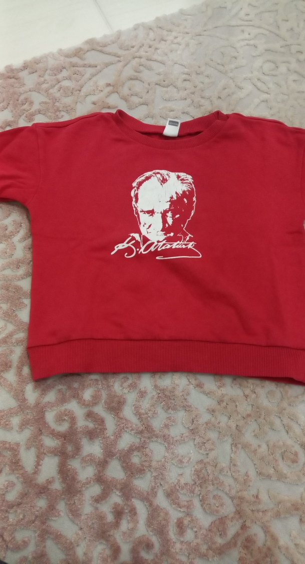 Kız veya erkek çocukları için uzun kollu, yuvarlak yakalı, bol kesim kırmızı sweatshirt. Ön kısmında parlak baskı deseni bulunur. Rahat ve sıcak kumaştan üretilmiştir.